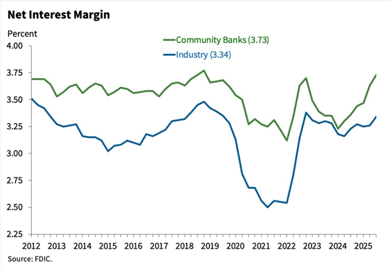 Strong capital positions among community banks and the wider industry support lending and provide a buffer against potential losses across the sector.Overall, Q3 2025 was a strong quarter for community banks: higher profitability, expanding margins, deposit and loan growth, good capital, and stable asset quality. The FDIC’s Q3 report demonstrates that community banks are in a healthy position, successfully balancing growth, profitability, and stability as they navigate the evolving economic landscape.