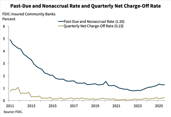 Source: FDIC Q3 Community Bank Charts and DataCommunity banks delivered a notably strong performance in Q3, with widespread earnings growth, revenue expansion, and improved operating efficiency, as well as broad-based profitability gains.2. Asset quality remains good overall.